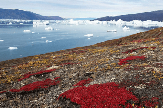 Другая уникальная черта этих мест – контрасты ландшафтов. Осенняя тундра покрыта яркими цветами. Рядом высятся характерные для Восточной Гренландии «полосатые» горы, где пластами выделяются разные породы и цвета. А невдалеке мерцают голубым огромные айсберги.